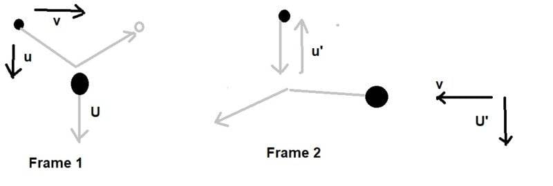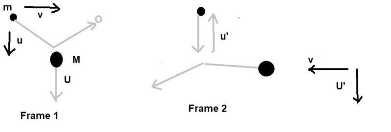 We assume that ##v## is relativistic, while ##u \ll c## and ##U \ll c##.