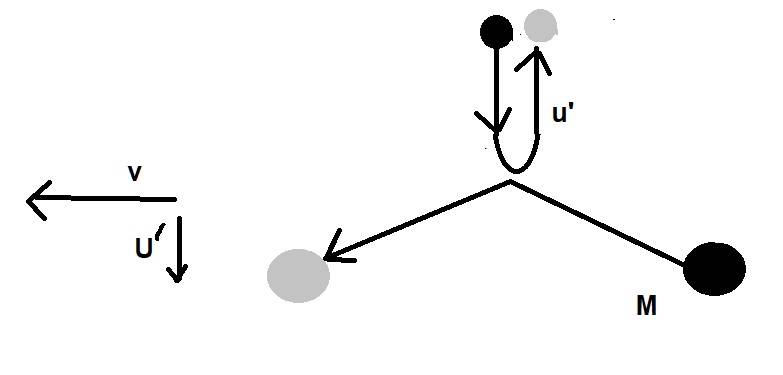 The large mass is initially moving at velocity ##-v## in the x-direction. After the collision, it is moving with a small velocity ##-U'## in the y-direction, as well. As before, we can write, approximately, the momentum in the y-direction after the collision as ##-M f(v) U'##.