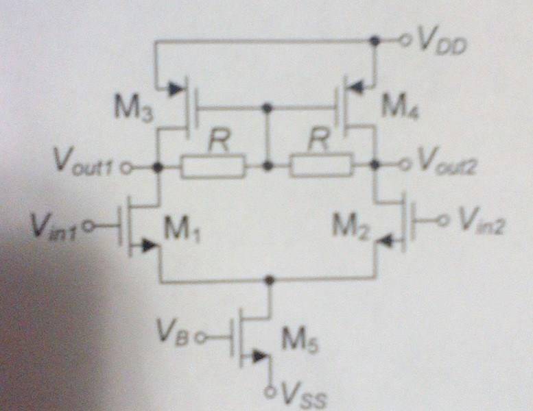 For differential amplifier on scheme calculate voltage gains Av1=vout1/(vin1-vin2) and Av2=vout2/(vin1-vin2). MOSFET's M1 and M2 have same characteristics. MOFSTE's M3 and M4 have same characteristics. All MOSFET's are in saturation. Assume that gm*rds>>1.