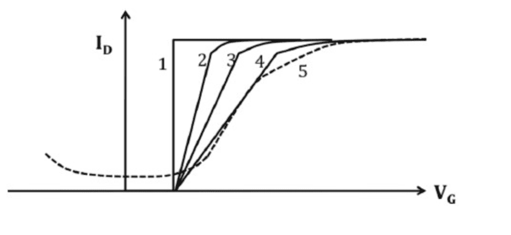 I am inclined to select 1), as it is not likely to have a sharp transition from subthreshold to Quadritica region. However, graph 5 also looks strange, since it somehow shows current in at subthreshold region. I am therefore confused about whether it should be 1) or 5).
