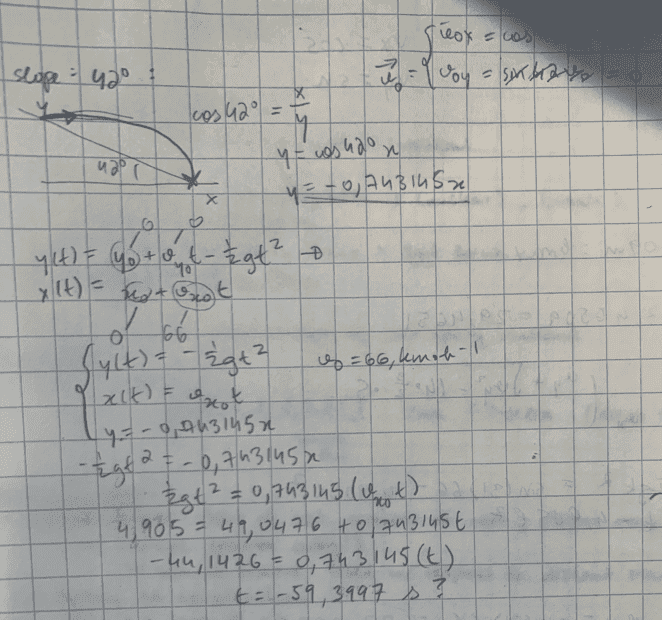 - How do you find the time in the air of an object kicked horizontally from a slope of 42º, knowing the speed?