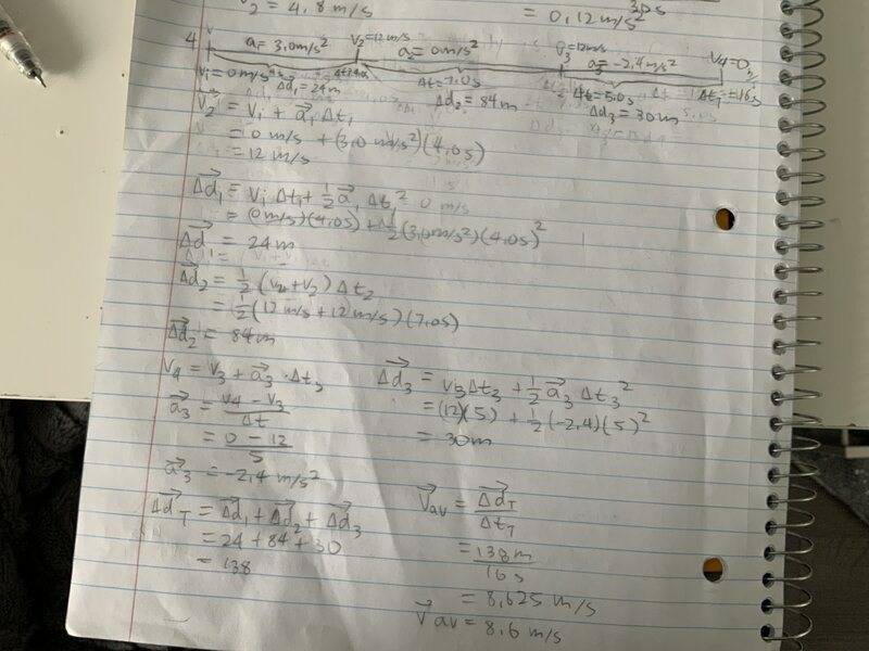 An object starts from rest and accelerates at 3.0 m/s2 for 4.0 s. Its velocity remains constant for 7.0 s, and it finally comes to rest with uniform deceleration after another 5.0 s. Find the following: