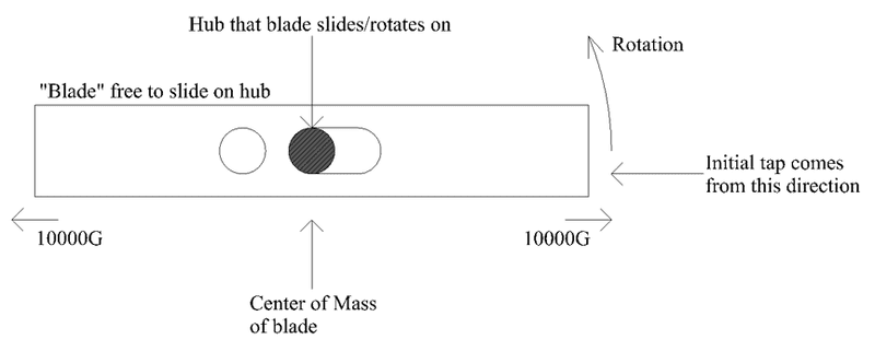 Here is the problem: I built a prototype of this device and it seems that sometimes the blade does not slide much in the half a revolution it has before it hits the enemy robot. At 12000rpm the blade only has 0.0025 seconds between initial tap and huge whack. Suppose the blade is initially knocked in 0.01 inchs with respect to the hub. If the blade weighs 60 grams how far will it advance in the 0.0025 seconds before the business end makes it half a turn around that hits the other robot? I suspect for my purposes some simplifications to the problem can be made as I do not need absolute accuracy. For example we can probably assume the speed of the blade does not vary and the tips of the blade always see 10000G.