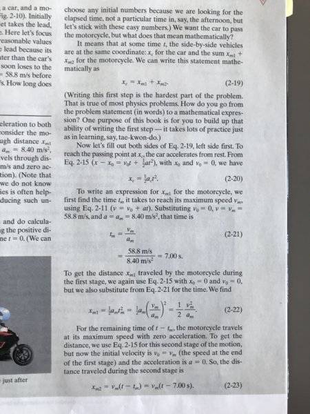 This is a problem out of the text with step by step directions. What was done was form an equation that relates the positions of the car and motorcycle: ##x_c=x_{m1}+x_{m2}## where the m1 is when the motorcycle is accelerating, and m2 is once it has reached its max speed and the acceleration is zero.