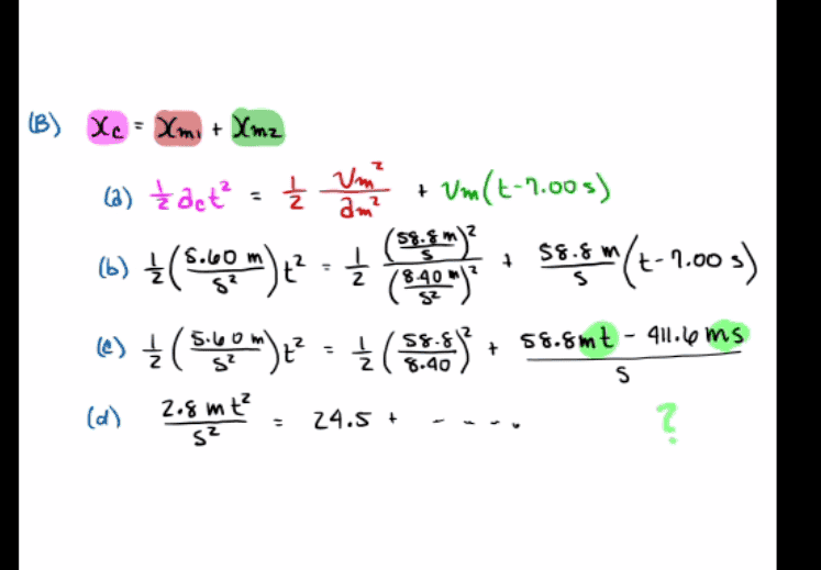 $$\frac{1}{2}a_ct^2=\frac{1}{2}\frac{v_m^2}{a_m}+v_m\left(t-7.00sec\right)$$