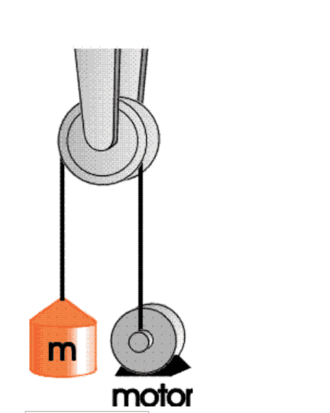 When the motor in the figure below lowers the m = 1200kg mass, it produces a tension of 1.15E+4N in the cable on the right side of the pulley. The pulley has a moment of inertia of 71.3kgm^2 and a radius of 0.794m. The cable rides over the pulley without slipping. Determine the acceleration of the m = 1200kg mass. Use g=9.81m/s^2.