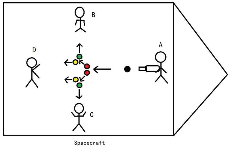 However, the spaceship will have moved to the right in between the ball being fired and being caught. Let's say that distance is ##D##.