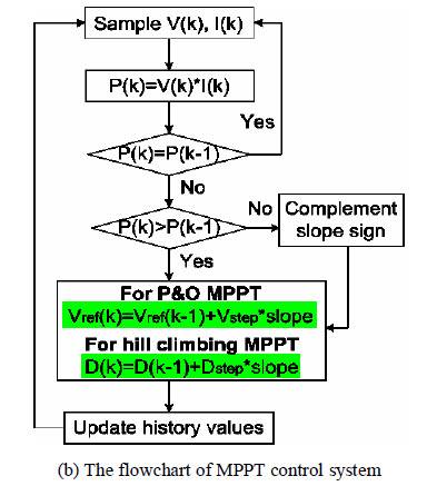 Reference #2, page #805, also lists a flow diagram. Near the end it makes a distinction between perturb and observe algorithm and hill climbing by saying "For P&O MPPT Vref(k)=Vref(k+1)+Vstep*slope" and "For hill climbing MPPT D(k)=Dref(k-1)+Dstep*slope". I understand the hill climbing and how duty cycle is used to change the input voltage of panel to operate it at maximum power point. P&O changes the Vref instead of duty cycle but it can only change the Vref through duty cycle. For both methods, at the end od day, it's the duty cycle which regulates the voltage. So, does the difference only lie in the wording, or is there more to it? Could you please help me with this? Thank you.