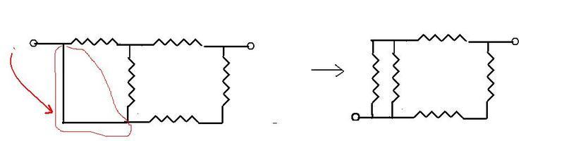 It seems to me that the 2nd 2ohm resistor (the one that's pointed vertically) has 2 different currents going through it in opposite directions. I also think that the 2nd 2ohm resistor is in parallel with both the 3ohm and 4ohm resisistors. The first 2ohm resistor also seems to be parallel with the other three resistors. So if I redrew the circuit I would say that all 4 resistors ultimately all have a parallel relationship to each other, but I'm really not sure?