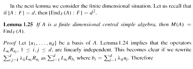 " ... ... Therefore ##[ M(A) \ : \ F ] \ge d^2 = [ \text{ End}_F (A) \ : \ F ]## ... ... "Can someone please explain exactly why Bresar is concluding that ##[ M(A) \ : \ F ] \ge d^2## ... ... ?Question 2
