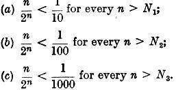 then how would I find a number N such that (n)/ (2^n) < 1/ 10 ( or any other epsilon)? In other words how would I solve this equation?