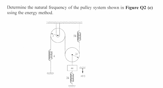 The discussion focuses on calculating the natural frequency of a pulley system using the equation ma + kx = 0. The user expresses familiarity with solving similar problems when the spring is positioned centrally but encounters difficulties with the current setup. The conversation highlights the importance of understanding free body diagrams in analyzing mechanical systems. Ultimately, the user confirms they have resolved their issue.