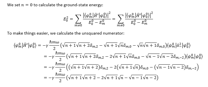The discussion revolves around calculating the second-order correction to the ground-state energy in a quantum mechanical system, specifically using perturbation theory. The perturbed Hamiltonian involves ladder operators acting on eigenstates.
