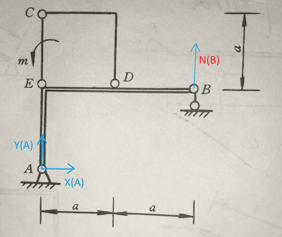 We should analyse ECD instead. Since arm CD is a two force members, so N(C) in in the direction where CD connects by these two points. The distance from E to diagonal CD is a/√2. So we have N(C)=√2 m/a. Because N(C)=N(E) ( N(C) and N(E) together form a couple), N(E)=√2 m/a.