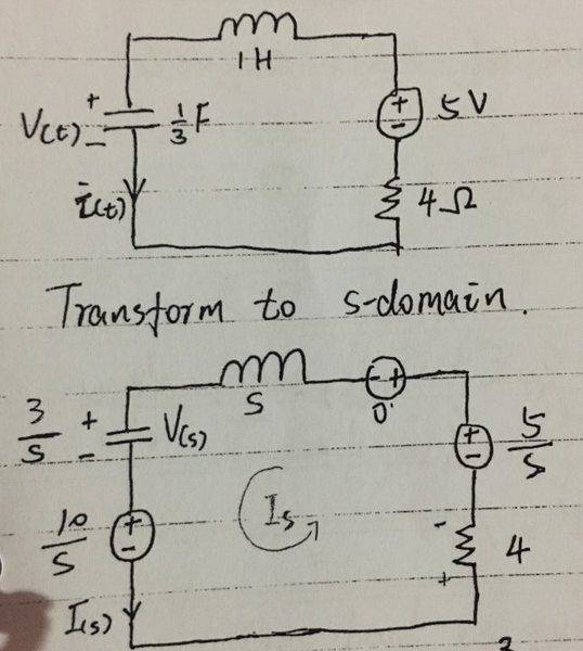 However for the 2nd circuit diagram (picture 2) when asked to transform to s domain. Why does this answer include the 10/s. To my understanding because the switch already switched to b, the 10V is no longer considered hence shouldn't be included as 10/s in the transformation circuit.