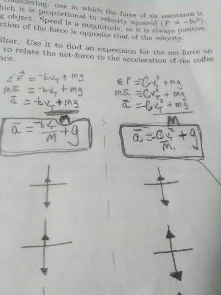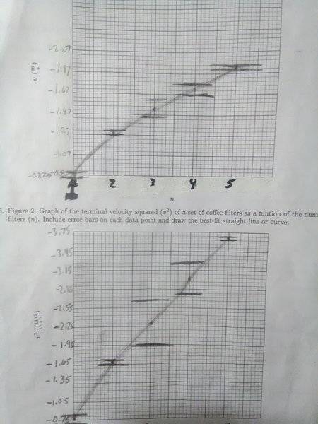 The discussion revolves around understanding the effects of air resistance in a lab experiment involving coffee filters. Participants are exploring the relationship between drag force and velocity, specifically comparing linear and quadratic models of drag force as they relate to terminal velocity.