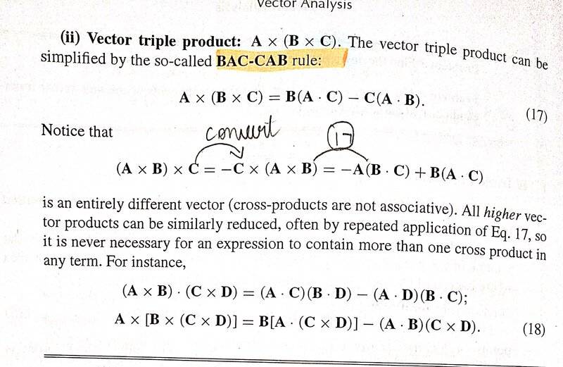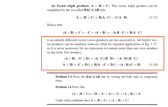 - One participant suggests that the second equation in (1.18) can be derived from (1.17) by applying it to \mathbf{A} \times (\mathbf{B} \times \mathbf{E}) and setting \mathbf{E} = \mathbf{C} \times \mathbf{D}.