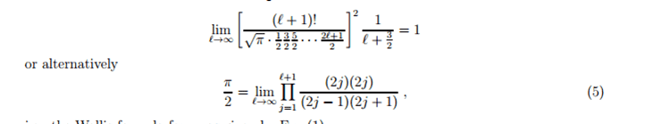 The discussion centers on the conversion of a limit equation as presented in a specific paper. The key transformation involves recognizing that the continued product from 1 to l+1 results in ((l+1)!)^2. Additionally, the terms in the numerator can be simplified by dividing by the denominator, which includes a sequence of odd integers squared. The manipulation of the denominator's terms, particularly the inclusion of (2j-1)/2 and (2j+1)/2, is crucial for achieving the desired formula (5). Furthermore, the term √π is squared and repositioned to the numerator, while the algebraic simplification of 1/(2l+3)/2 to 2/(2l+3) is also highlighted.