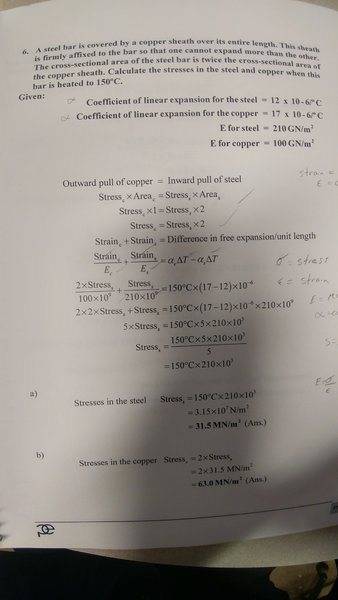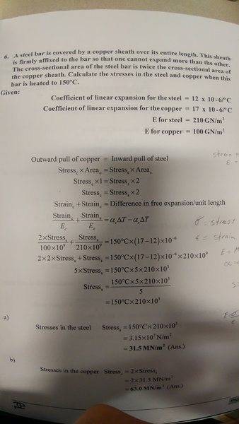 - A different participant proposes a correct formulation for the stress in the rod, incorporating both thermal expansion and mechanical strain, and provides equations for both materials involved.