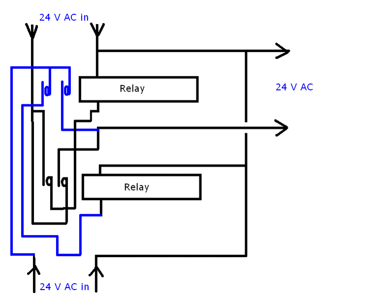 Soo...I have two 24VAC sources and need one output to the solenoid of the main valve. If either one of the sources is active/triggered by any of the timers, output should shoot 24VAC. Sprinkler Valve Solenoid shouldn't take more than 2 amps