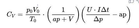 - $$C_{V}=\frac{p_{0} V_{0}}{T_{0}} \cdot\left(\frac{U \cdot I \Delta t}{(a p+V) \cdot \Delta p}-\frac{a p}{a p+V}\right)$$