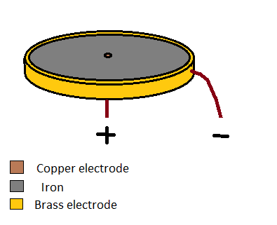 Thanks for the input. The only reason I have a brass ring is because the experiment I am going to conduct has one. I will prepare the iron disk this week and take a few pictures of the iron filings on cardbord.berkeman said:BTW @Magnetosphere -- in the setup as shown in your original diagram, the outer conducting band will not have a substantially greater conductivity compared to the iron disc. So the current distribution you get in the iron disc will not necessarily be mostly radial. I think it will be concentrated between the inner conductor and the tap point on the outer conducting band where the 2nd wire comes off. So you will esentially get current only in the part of the disc between the inner and outer wires, IMO. The iron filings will show that current distribution, instead of swirling like they would for a uniform radial current distribution.