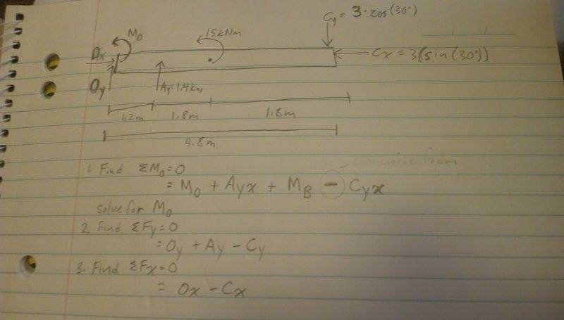 The discussion revolves around a beam problem involving net forces and net moments to determine the reaction forces at point O. Participants are exploring the differences in their approaches and the assumptions made regarding torque reactions.