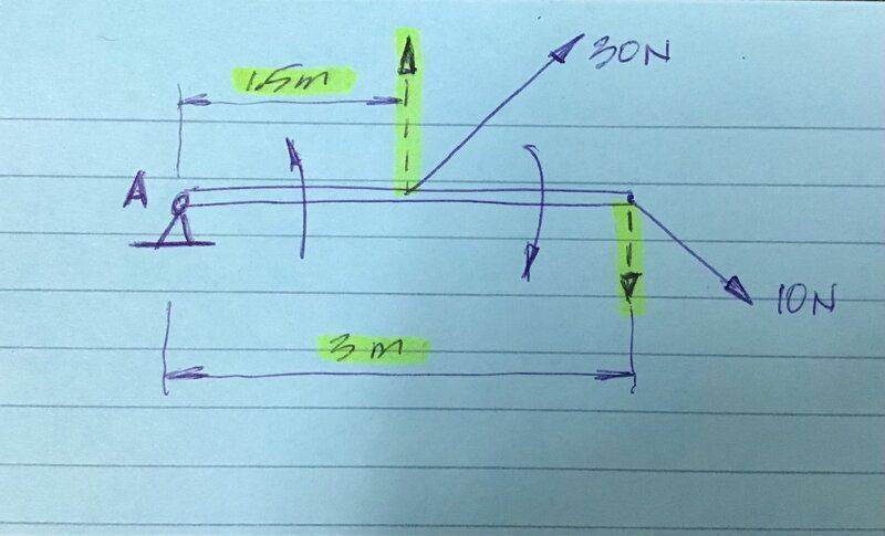 Net torque = 30 cos45 x 1.5 - 10 cos30X 3