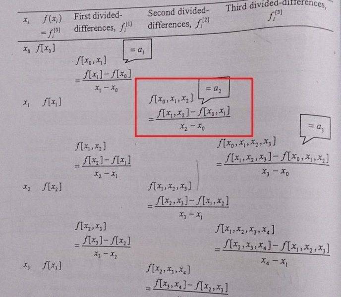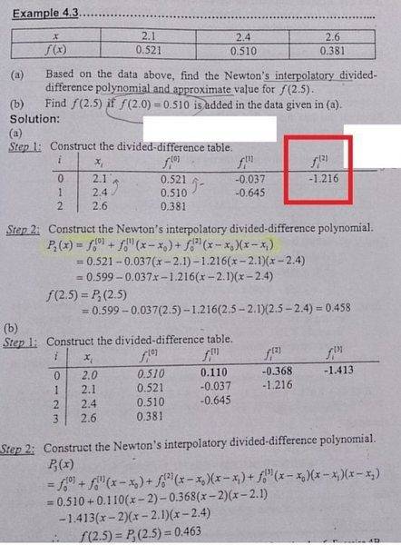 The discussion centers on the Newton interpolary difference formula, specifically addressing the calculation of the second divided difference using the formula f(x1, x2) - f(x0, x1) / (x2 - x0). The user attempted to compute this difference with specific values, resulting in a final answer of -0.143. The values used in the calculation were f(x1, x2) = 0.510 * 0.381 and f(x0, x1) = 0.521 * 0.510, with x2 = 2.6 and x0 = 2.1.
