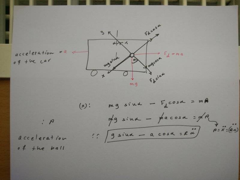 The problem involves a car moving with constant acceleration and a ball hanging from the ceiling that is released at time t=0, causing it to swing. The objective is to find the maximum angle of the ball during its oscillation, utilizing Newton's second law as part of the analysis.