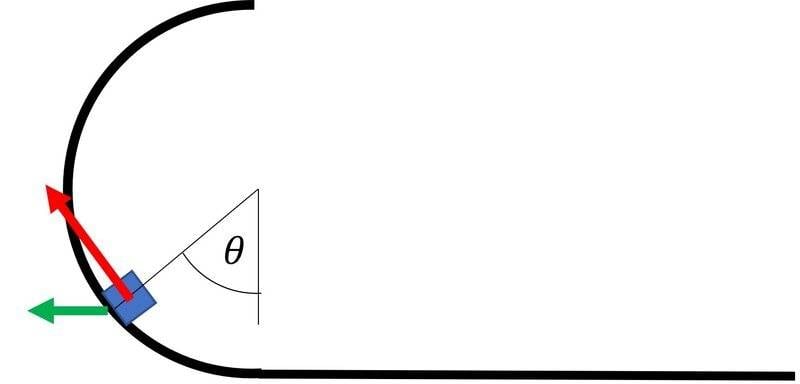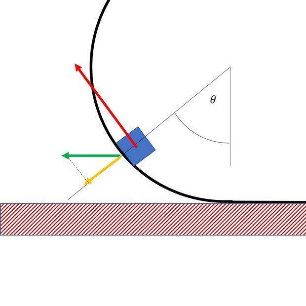 The discussion revolves around a problem involving Newton's laws, specifically focusing on a block sliding on another block on a frictionless semi-circular track. Participants are exploring the conditions under which the two blocks maintain contact as the smaller block moves along the path.
