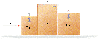 Masses are as followed: M1= 28 kg, M2= 18.7 kg, M3= 28.7 kg. The applied force on the box is 644 N