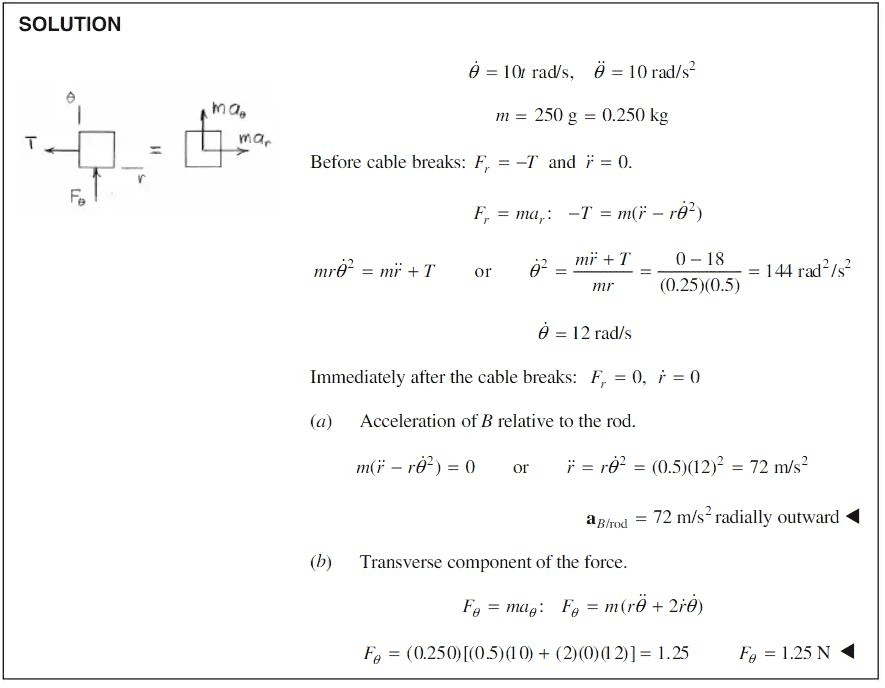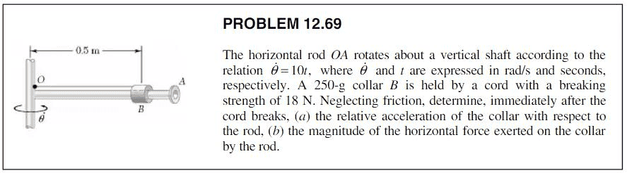dθ/dt and t are expressed in rad/s and seconds, respectively. A 250 g collar B is held by a cord with a breaking strength of 18 N. Neglecting friction, determine,immediately after the cord breaks, (a) the relative acceleration of the collar with respect to the rod, (b) the magnitude of the horizontal force exerted on the collar by the rod.
