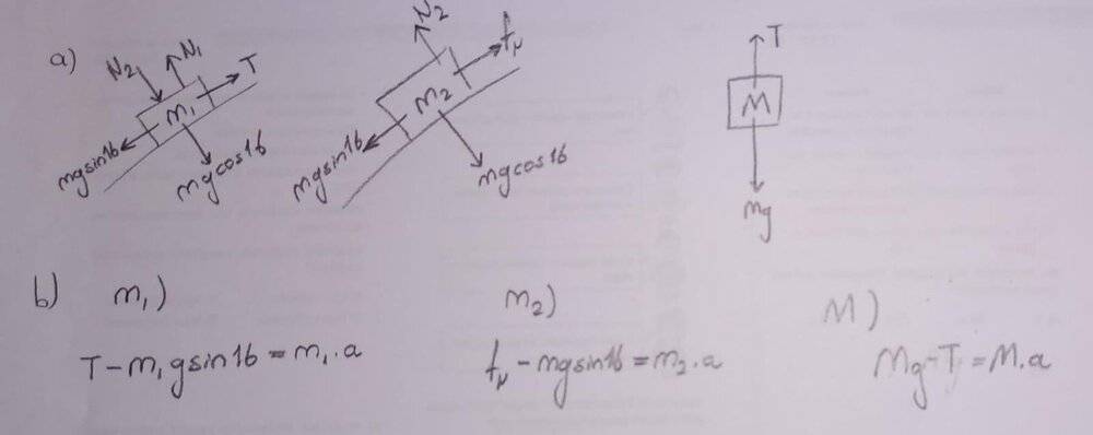 As you correctly stated in post #28, the forces that act on M are gravity and the tension. Those are the only forces that should appear in the equation. Yes, it may turn out that the tension is equal to ##(m_1+m_2)*g*\sin(16) ##, but take it one step at a time.mustafamistik said:##(M*g)+(m_1+m_2)*g*sin(16) =M*a##