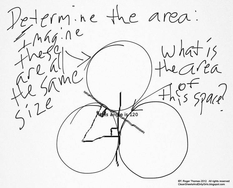 What that chicken scratch above shows is a problem I have not yet been able to solve. By what formula can one determine the area of the space in between three circles of the exact same size touching each other in the arrangement shown above?