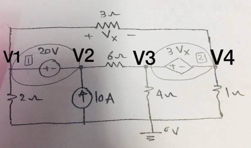 The discussion revolves around the formulation of nodal equations in circuit analysis, focusing on identifying and labeling node voltages, particularly in the context of supernodes. Participants seek clarification on the relationships between various node voltages and the substitution of equations in the process of solving for unknowns.