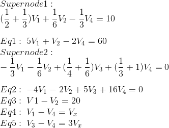 Some assumptions about the circuit configuration and the definitions of supernodes may not be fully articulated, leading to potential misunderstandings regarding the relationships between the node voltages.