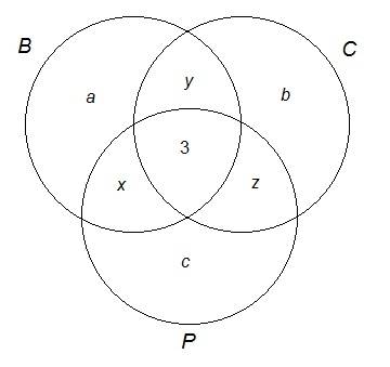 There is a seminar in which 34 students participated. Every student got a certificate, 14 in biology, 13 in chemistry and 21 in physics, and only 3 students got all three certificates. How many got certificates in only one area and how got certificates in only two areas?? Please help you must draw Venn diagrams and solve with equation but i can't seem to get the answers