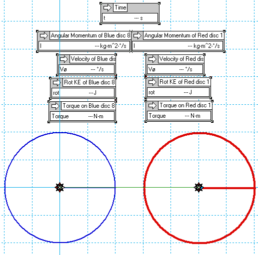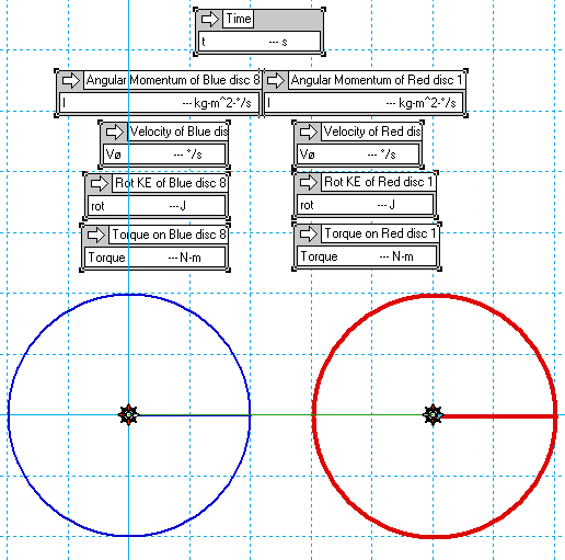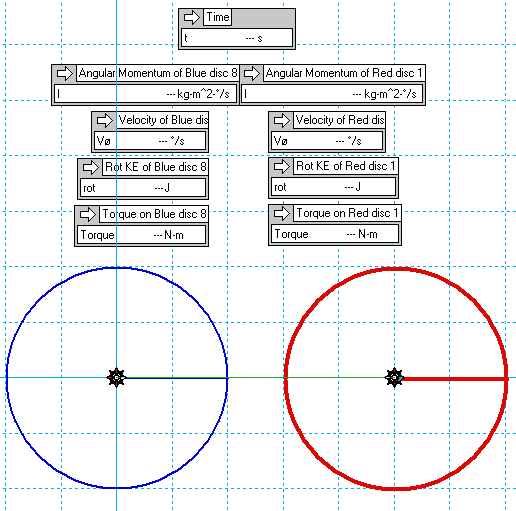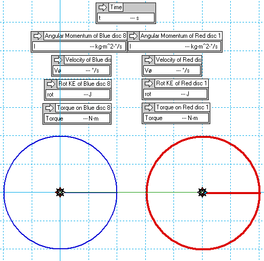 Final example, reverse the sign of the above 200°/s disc, relative to the other one, and upon locking together, the CW and CCW momentums equalise to just 50°/s velocity on each disc - again, seemingly destroying momentum and energy.