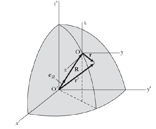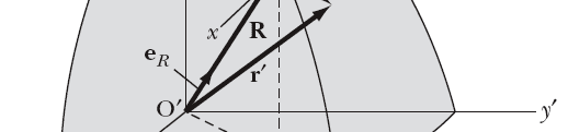 where R is the radius of Earth, r is the position of the object measure from the rotating frame of reference which is moving at a constant velocity and constant angular velocity, r' is the position of the object measure from the center of the Earth