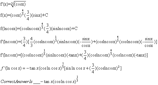 Given that f'(x)=(cosx)^ (1/3) then find out dy/dx f(ln cosx)=?