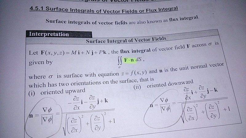 why it will become like this ?vela said:The surface ##\sigma## is defined by ##\phi(x,y,z)=0## where ##\phi(x,y,z)=z-f(x,y)##, and the normal is the gradient of ##\phi(x,y,z)##. What do you get when you calculate that?