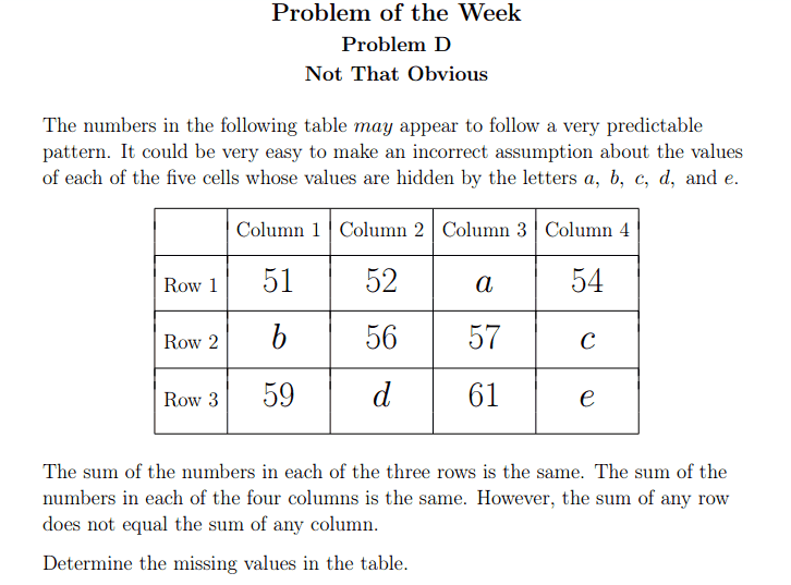 The discussion revolves around solving a system of equations derived from a table with missing numbers. Participants explore various methods to relate the variables and derive their values, focusing on mathematical reasoning and problem-solving techniques.