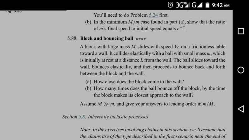 Now, I jumped to solve part b of question. To find the number of bounces,we note that mass losses momentum of -2mV per bounce(This can be worked out from conservation of momentum and energy). Now initial momentum was MV. Then since per bounce loss is -2mV then after n bounces ,it comes to rest. Hence: Mv-2mnv=0 $\implies$ n=M/2m. However,when I checked solution,it deferred much from this one. There was factor of π/4 in solution. What is wrong with my reasoning?