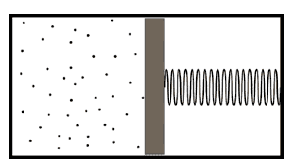 - In a cylindrical piston of section S a piston can move without friction. A mole of ideal monoatomic gas is confined to the left, the right chamber is empty and contains a spring with elastic constant k which would be at rest if the piston were all the way to the left.