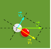 If two objects (lets assume they are of different mass as I know the problem works for objects of the same mass) collide (as in the attachment where V = initial velocity of white ball and V1 = velocity of red ball, V2 = final velocity of white ball)