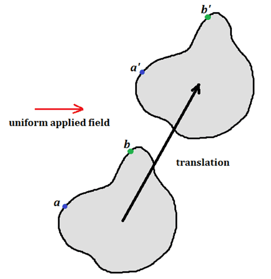 That's right. For two points ##a## and ##b## on the surface of the sphere you can have a translation that takes ##a \rightarrow a' = b##. But, even if the applied field is uniform, we cannot say that the "physical condition" of point ##a'## after the translation is the same as the physical condition of point ##b## before the translation. The "physical condition" at a point on the spherical surface includes the value of the applied field at that point as well as the relation of that point to all of the other points of the sphere. For example, as you noted post #19, the orientations of the normals at ##a'## and ##b## are different.Delta2 said:So @TSny in the case of a dielectric sphere in a uniform external E-field, the second symmetry doesn't work?