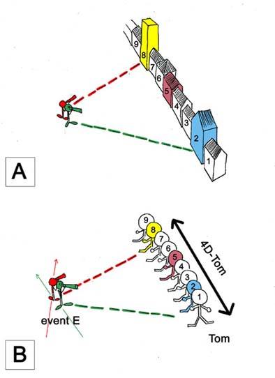 You might counterargue by saying "Wait a minute, maybe for red observer the yellow tower has number 9 instead of number 8, and he (red observer) does not know it until he observes it...". No, my example shows the facts as they were reported in the observation experiment. In that observation element red observer saw yellow Tom, green observer a blue Tom. Period. And why did they see that and only that? Because the events are 'observer INdependent' out there, part of 4D Spacetime to be observed. For red observer event 'yellow-Tom-with-clock-at-8' has always been simultaneous with event E, even if he didn't make an observation during his traveling. For red observer event 'Blue-Tom-with-clock-at-2' has always been non simultaneous with event E. even if he didn't make an observation during his traveling. Etc.