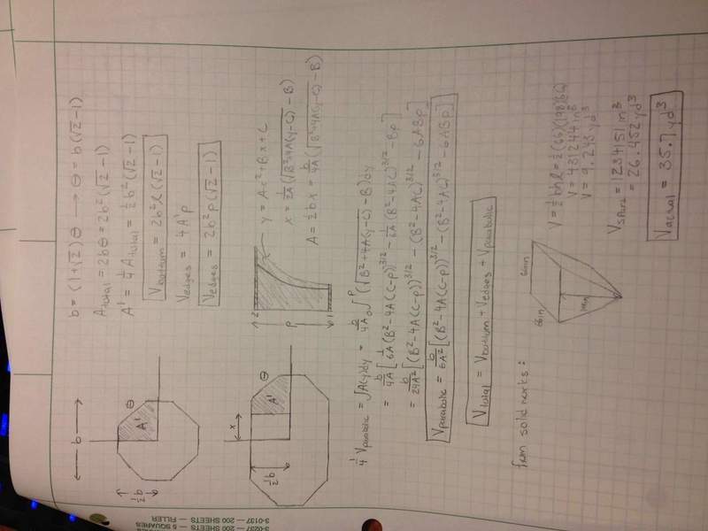 When I plug in test values in my final formula, I get 50.7 cubic yards but I know for sure that the answer is 35.7 cubic yards. In the attached files here are the variable values that I am using:
