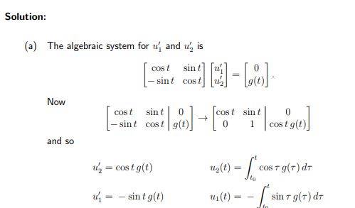 Hi there, I don't nee help with solving a question, so much as understanding a step in the provided worked solution. It's using variation of parameters to solve the ode y''+ y = g(t). I've attached the steps in the picture file, and the bit after the word 'Now' what are they doing to the first matrix in order to get the one following the arrow? It might be really obvious but I don't quite get what they've done.